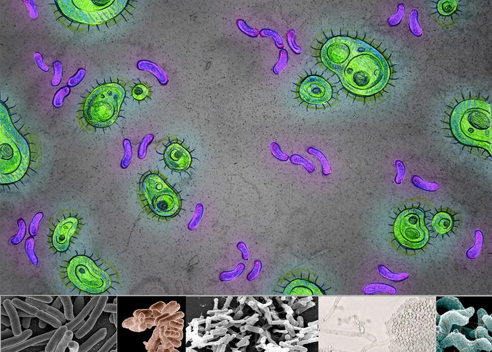 다양한 미생물 종들의 장내 분포를 보여주는 그림과 여러 장내 미생물 종의 현미경 영상들.